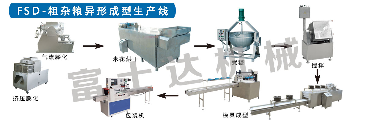 工艺流程:膨化造?!娓?油炸→煮糖→拌糖→整平切块→包装→入袋装箱